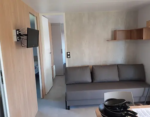 Description du bien Le lodge comprend : 1 séjour un coin cuisine 1 chambre avec 1 lit double 160cm*200cm (oreillers et couette fournis)...Référence : AN-00045Type de bien : Locatif (Mobil-home)pièces : 2 chambresNombres de personnes : 6Surface : 30,00m²Voir le détailGénéralTélévisionExtérieurParkingTerrasseTerrasse couverteCuisineMachine à caféMicro-ondesRéfrigérateurSalle de BainSalle de Bain1WC séparéSalonCanapé convertible -